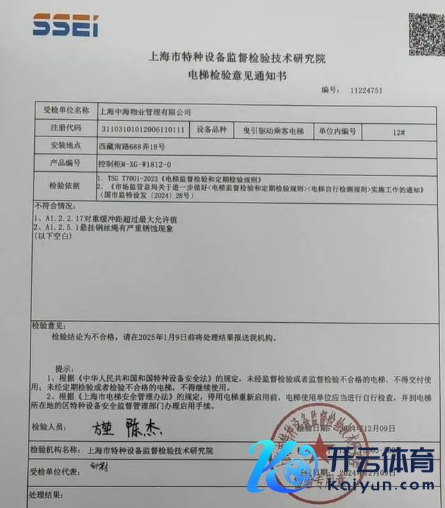 住户们讲,就在考验敷陈出来后,物业坐窝停运了两部电梯,只留住独一的电梯粗浅运转。记者在住户提供的这份由上海市特种开荒监督考验时刻洽商院出具的《电梯考验意见见知书》上看到,西藏南路688弄18号电梯有两项不适宜门径情况:“对重缓冲距向上最大允许值”和“吊挂钢丝绳有严重锈蚀气象”,考验论断为“分离格”,考验日历为2024年12月9日。