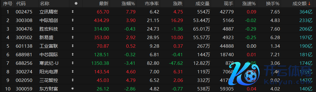 个股方面,立讯精密成交额居首,为363.54亿元。自后是中际旭创、胜宏科技、新易盛、工业富联,成交额差异为232.78亿元、205.94亿元、196.58亿元、190.21亿元。